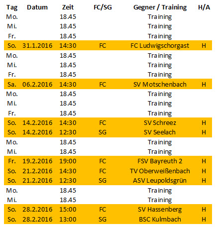 TDC Lindau 2 : FC Neuenmarkt So. 06.03.2016 um 13:00 Uhr. Treffpunkt 12:00 Uhr, Aufstellungen: Hohner, Held, Mösch, Chr. Fischer, Wesner, Heinrich, Bauerschmidt, Kiefl, Sünkel, Rei�aus, Wagner, Mühlbauer, Promeuschel, A. Fischer