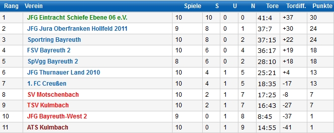 Die erste Niederlage in der Saison 2011 / 2012 musste die Ersatzgeschwächte JFG gegen die Zweite der Altstädter hinnehmen. Ersatzgeschwächt könnte der Spitzenreiter nur mit einem Auswechselspieler antreten, die Altstadt hingegen konnte sich auch noch mit drei Spielern Ihrer 1. bedienen, die allerdings nicht sonderlich herausragten. Nichtsdestotrotz war es eine von Kampf geprägte Partie mit Chancen auf beiden Seiten. Die Erste Halbzeit endete 0:0 wobei man den Pfosten-Knaller von Jannik Buss erwähnen muss, der das ganze Spiel in eine andere Richtung drehen hätte können. In der zweiten Halbzeit hatten dann doch die Altstädter mehr Spielanteile und die besseren Chancen. Beim 0:1 verletzte sich dann auch noch Torwart Flo Engelbrecht und Feldspieler Nick Riediger musste ins Tor, der seine Sache zwar gut machte, dann jedoch wieder auf dem Feld fehlt. So konnte die Spielvereinigung auch noch auf 0:2 und 0:3 erhöhen. Die Heimelf wachte zu spät auf und kam kurz vor Schluss durch einen schönen Freistoß von Demel und ein toll herausgespieltes Tor von Schott noch zum 1:3 und 2:3 Anschlusstreffer. Zu mehr reichte jedoch die Zeit nicht.