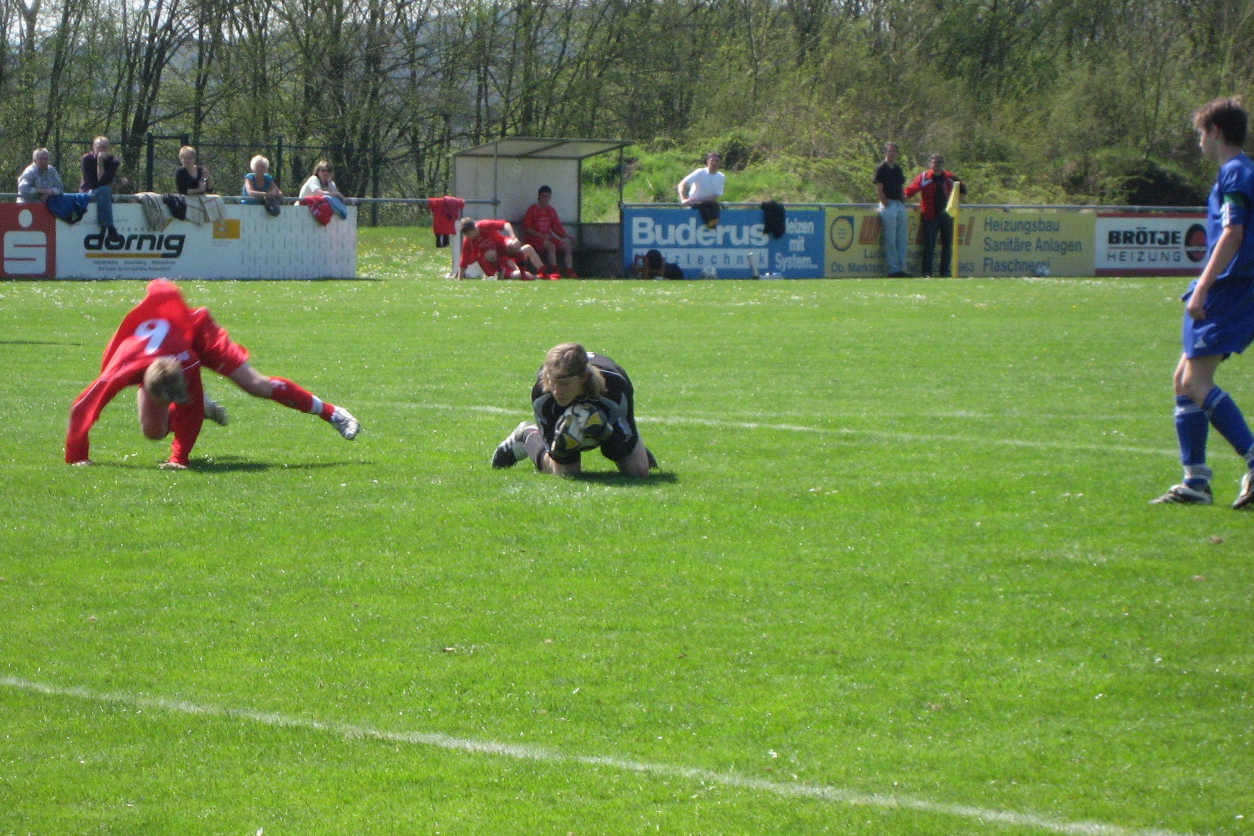 Au weiah! Das war mal wieder nichts für schwache Nerven. Obwohl unser Team mit dem schnellsten Torschuss der Saison nach nur 10 Sekunden gleich mal ein Ausrufezeichen setzte, zeigten sich die Hausherren unbeeindruckt und entwickelten ein relativ druckvolles Spiel auf unser Tor. Aus einem Tempogegenstoß von "Flankinho" Stefan, der auf seinen Sturmpartner Daniel quer in die Mitte legte, wurde aus 11 Metern Torentfernung leider nur ein laues Lüftchen. In der 6. Spielminute legte Keeper Nico die erste Glanzparade aufs Parkett, nachdem die Creußener mit einem Pass in die Tiefe unsere gesamte Abwehr aushebelten. Aus einer schnell ausgeführten Ecke von Philipp auf Fabian entwickelte sich unsere nächste gute Chance. Die Flanke auf den 2. Pfosten nutzte Kevin zu einem schönen Kopfball, aber der Torhüter aus Creußen hatte etwas gegen unsere Führung. Diese hatte in der 13. Minute Patrick auf dem Fuß. Aber irgendwie will ihm zur Zeit einfach kein Tor gelingen. Das Traumzuspiel kam von Kevin, der seine Vorbereiter-Qualitäten mal wieder unter Beweis stellte. Patrick kam mit Vollgas aus halb rechter Position in den Strafraum wie ein ICE in den Münchner Hauptbahnhof und schob den Ball zwar gekonnt am Keeper - aber leider auch am Pfosten vorbei. In der 18. Minute hatten wir Glück, als der Schiri nach einem groben Schnitzer von dem zur Zeit in abgrundartiger Form spielenden Kevin "Bayern" nicht auf Elfmeter für die Heimelf entschied. Aber Bayern selbst sorgte nur zwei Minuten später für Gerechtigkeit und leis seinen Gegner wieder davon laufen. Der umkurvte in unserem Strafraum noch 3 Spieler, die wie Trainingsstangen herumstanden, und schob unhaltbar für Nico ins lange Eck ein. Das war der Aufgalopp für die zehn spielentscheidenden Minuten. In Minute 22 verfiel Philipp in einen lethargie-ähnlichen Zustand und so konnte sein um ein Vielfaches wacherer Gegnspieler zum 2:0 einköpfen. Das 3:0 folgte wieder nur zwei Minuten später, nachdem Bayern offensichtlich gerade versuchte "Blinde Kuh" zu spielen. Darauf hatte sein Gegenspieler aber keine Lust und verlud stattdessen den aus dem Tor eilenden Nico mit einem Klasse-Heber zum 3:0. Und weil das so viel Spaß macht (zumindest den anderen), machte der gleiche Spieler in der 28. Minute das 4:0. Wieder war Nico ohne jede Chance, weil sich Bayern und Denis diesmal einig waren, den ach so schnellen Creußener einfach mal laufen zu lassen - irgend wann muss der ja auch mal müde werden. Der tat ihnen aber den Gefallen nicht, sondern holte in der 29. Spielminute von der Strafraumgrenze zu seinem vierten Streich aus und schloss die vorläufige Hinrichtung unserer völlig desorientierten Truppe zum 5:0 ab. Damit war das Spiel praktisch gelaufen. Mit einer derart passiven Spielweise ist einfach bei einem so spielstarken und ballsicheren Gegner kein Blumentopf zu gewinnen. Unsere Jungs waren immer so spät dran, dass sie nicht einmal die Chance hatten, einen Gegenspieler mit einem Foul zu bremsen. Nach dem Seitenwechsel konnten es die Creußener etwas gemächlicher angehen lassen und so kamen wir wieder etwas besser ins Spiel. In der 52. Minute stellte Patrick wieder unter Beweis, dass ihm zur Zeit die Seuche an den Fußballschuhen klebt. Einen tollen Diagonalpaß von Fabian jagte er aus knapp elt Metern Torentfernung elend weit am Tor vorbei. Ein Lichtblick waren da nur die Aktionen von Flankinho, die aber entweder aufgrund unserer eigenen Schwäche oder aber durch gute Reaktionen des Creußener Torwarts zunichte gemacht wurden. Zu diesem verkorksten Spiel passte dann auch noch, dass der eingewechselte Andreas nach nur wenigen Minuten auf dem Feld verletzt ausgewechselt werden musste. Da musste schon die Heimelf nachhelfen, um uns wieder ins Spiel zu bringen. Eine verunglückte Rückgabe konnte Kevin in der 64. Minute leider nicht nutzen, aber den anschließenden Eckball von dem über weite Strecken des Spiels völlig untergetauchten Philipp drückte er nach einem Torwartfehler mit Macht zum verdienten Ehrentreffer über die Linie. In unserem Lager keimte nochmals Hoffnung, nachdem der zu einer ziemlich langen Denkpause auf der Auswechselbank vergatterte Daniel in der 70. Minute wieder ins Spiel kam und mit einem Zuckerpässchen von Maxi wie aus dem Lehrbuch bedient wurde. Leider zögerte er aber einen Moment zu lang und so hatte der Creußener Keeper leichtes Spiel. In der 72. Minute hätte sich Kevin nochmals in die Torschützenliste eintragen können. Eine tolle Flanke von Stefan über die gesamte Abwehr hinweg schob er aber unkonzentriert am Tor vorbei. Eigentlich war die Packung groß genug, aber mit einer weiteren Einlage aus der Abteilung "Schlafwagen" ermöglichte Philipp seinem Gegenspieler nur Sekunden vor dem Schlusspfiff nochmals höchste Glücksgefühle. Er versetzte sich dabei in die Rolle des neutralen Beobachters und Nico musste zum sechste Mal hinter sich greifen, ohne auch nur ein einziges dieser Gegentore verhindern zu können. Torschütze: 5:1 Kevin Dresel
