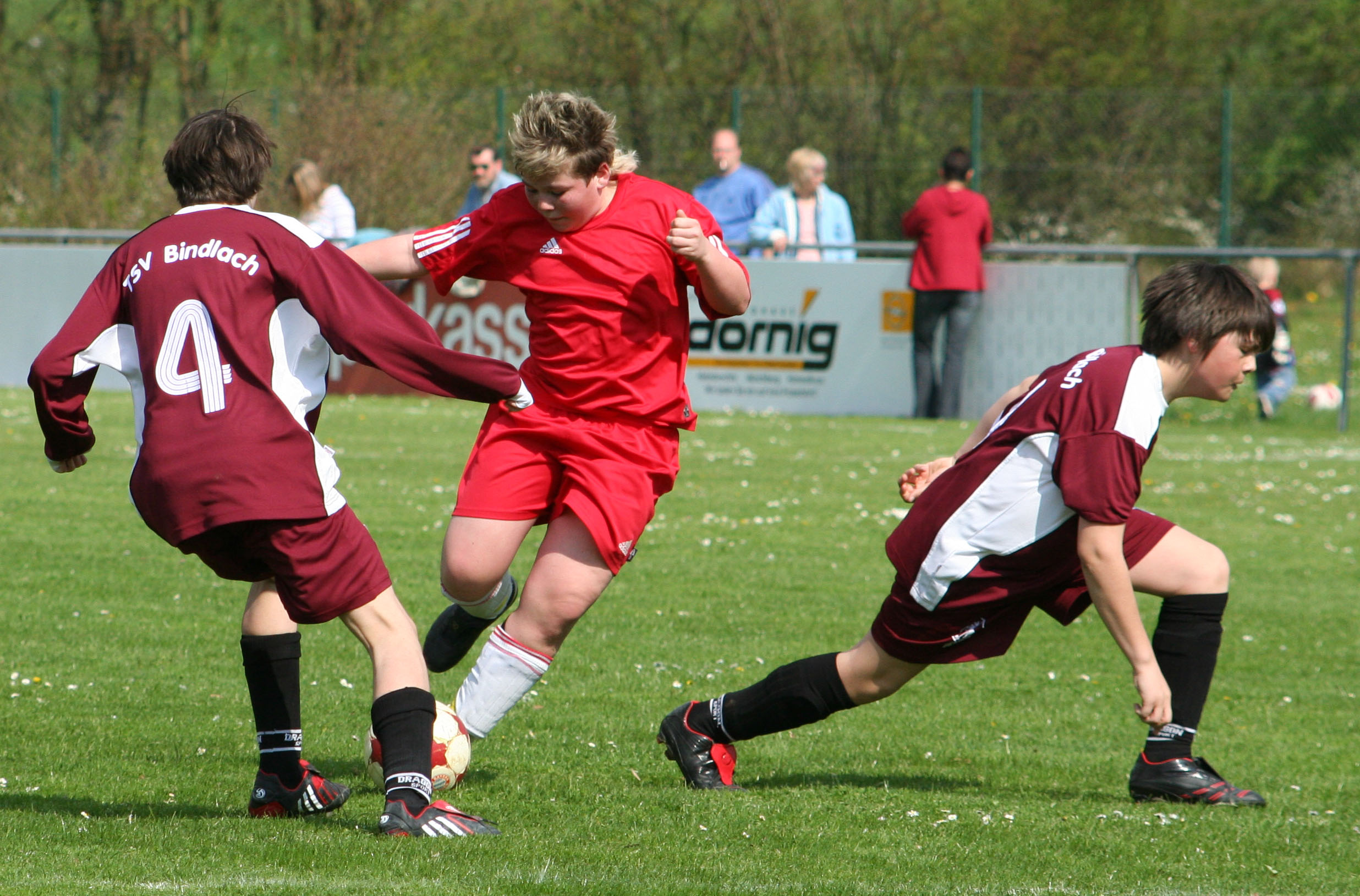Gegen den Angstgegner der JFG, den TSV Bindlach, wurde es wieder das berühmte Zitterspiel. Die Einheimischen begannen wie die Feuerwehr und spielten ihre technisch und läuferische Überlegenheit aus, so dass die Gäste aus Bindlach kaum über die Mittellinie kamen. Mangelhaft war wieder mal die Chancenauswertung. Alesandro Bochtis, Dominik Wunderlich und Dominik Müller überboten sich im Auslassen der klarsten Tormöglichkeiten oder hatten Pech beim Abschluss. Schließlich kam es wie es kommen musste. Die Gäste fuhren zwei gefährlich Konter und schon lag man 0:2 im Rückstand. Kurz vor der Pause gelang völlig verdient und mit einer schönen Einzelleistung im 16 Meter Raum Marcel Reissaus der verdiente Anschlusstreffer. Nach der Pause das gleiche Bild. Die JFG drängte und der TSV konterte. In der 45. Minute zog ein Gästespieler aus 25 Metern ab und der haltbare Ball landete zum 1:3 in den Maschen. In der 55. Minute eine ähnliche Situation, aber Torwart Martin Auerswald war diesmal machtlos und es stand 1:4 für die Gäste. Bemerkenswert zu diesem Zeitpunkt die Moral der Jungs der JFG . Keiner stecke auf und alle wollten noch den Ausgleich erzielen. Dies wurde dann auch letztendlich belohnt. In der 63. Minute setzte sich Alesandro Bochtis endlich mal durch und verkürzte auf 2:4. 4 Minuten später verwandelte Dominik Paul aus kurzer Distanz nach Flanke von Dominik Wunderlich. Das 4:4 erzielt „Knipser“ Marcel Reissaus eine Minute vor Schluss mit einem Dropkick aus 11 Metern.. Ein Lob der Mannschaft für ihre Moral, der Einstellung und der Kampfkraft, mit der sie noch das Spiel drehte aber letztendlich schmerzen doch die zwei verlorenen Punkten im Kampf um Platz Zwei.