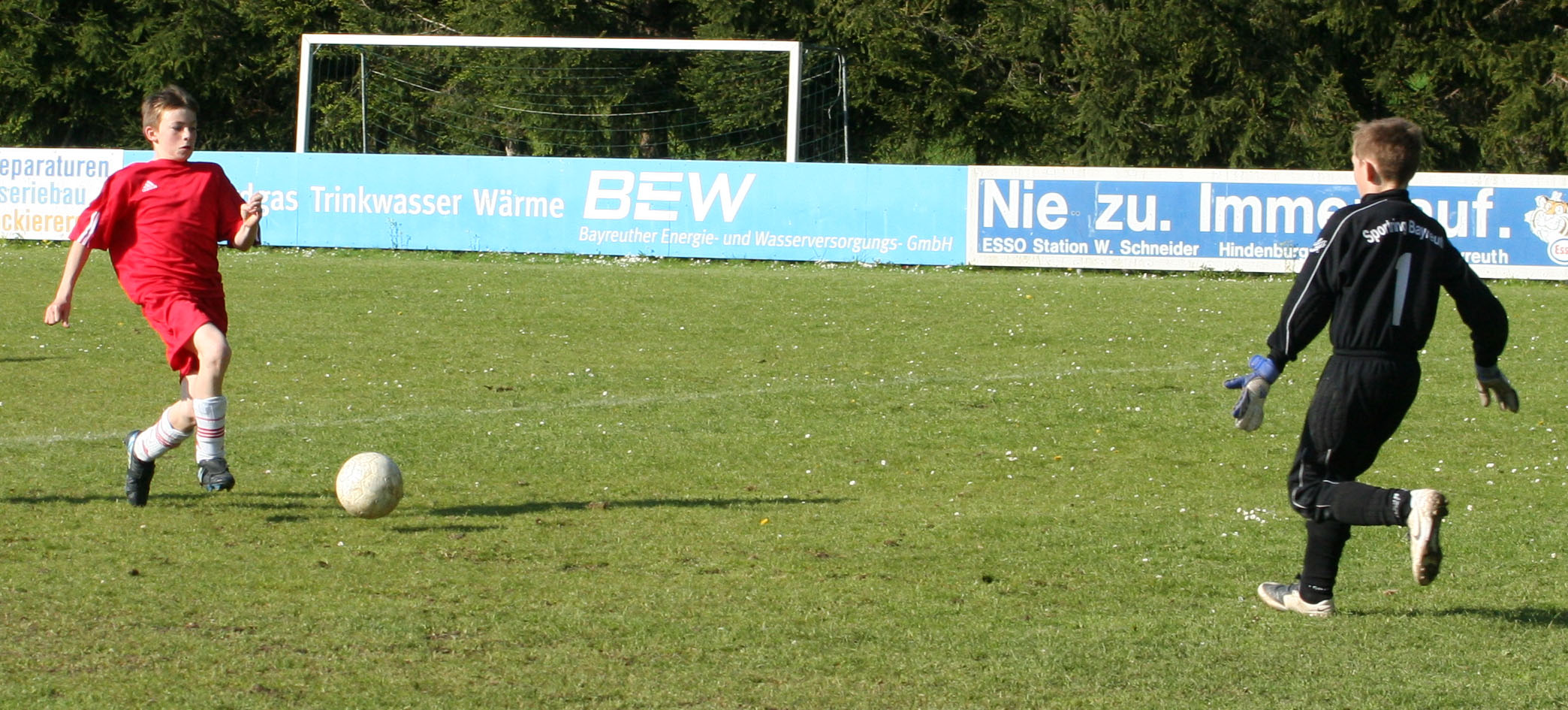 Am Samstag spielte unsere C-Jugend gegen die JFG Steinachtal. Wegen der vorausgegangenen heftigen Niederschläge wurde das Spiel kurzfristig von Ludwigschorgast auf den Hartplatz nach Neuenmarkt verlegt, der einwandfrei bespielbar war. Beide Mannschaften zeigten in der ersten Hälfte ein offenes und interessantes Spiel, in der die JFG Eintracht Schiefe Ebene nicht unverdient aber dennoch etwas glücklich mit 2:0 führte. Das 1:0 in der 13.Minute erzielte Marc Hentschel mit einer Bogenlampe aus 18 Metern, bei der der Torwart der Gäste sehr schlecht aussah. Das 2:0 in der 33. Minute durch Dominik Müller resultierte aus einem tollen Doppelpaßspiel mit Marcel Reißaus an der 16 Meter Linie. Nach der Halbzeit spielten die Jungs der Eintracht ihre konditionellen Vorteile aus und ließen die Gäste nicht mehr zur Entfaltung kommen. Das 3:1, wiederum durch Dominik Müller, durch einen strammen Schuss von der Strafraumgrenze und das 4:1 durch Alesandro Bochtis, der überlegt aus 11 Metern nach einer feinen Einzelleistung einschob, waren die logische Folge. Zwischenzeitlich kamen die Gäste auf 2:1 heran, als Torwart Jens Schmeißner Libero Alexander Wesner unglücklich im eigenen 5-Meter Raum anschoss und der Ball ins Tor kullerte. Ein Lob der gesamten Mannschaft für ihren Einsatz und ihrer Spielfreude, besonders der Defensive, die sicher stand und den Stürmern der Gäste nur wenig Entfaltungsmöglichkeit ließ. Steinachtal zeigte eine Leistung, die dem momentanen Tabellenplatz keineswegs entspricht und war ein Gegner der einen positiven Eindruck hinterließ.