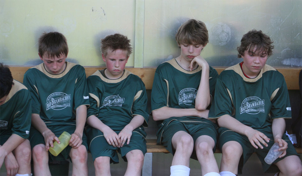 Keine gute Stimmung zur Halbzeit im Spiel gegen den FSV – schlechte Leistung der gesamten Mannschaft, kein Einsatz und ein Anpfiff von den Trainern – Alesandro, Marcel, Felix, Christoph und Alex sehen ziemlich "betröpelt" aus