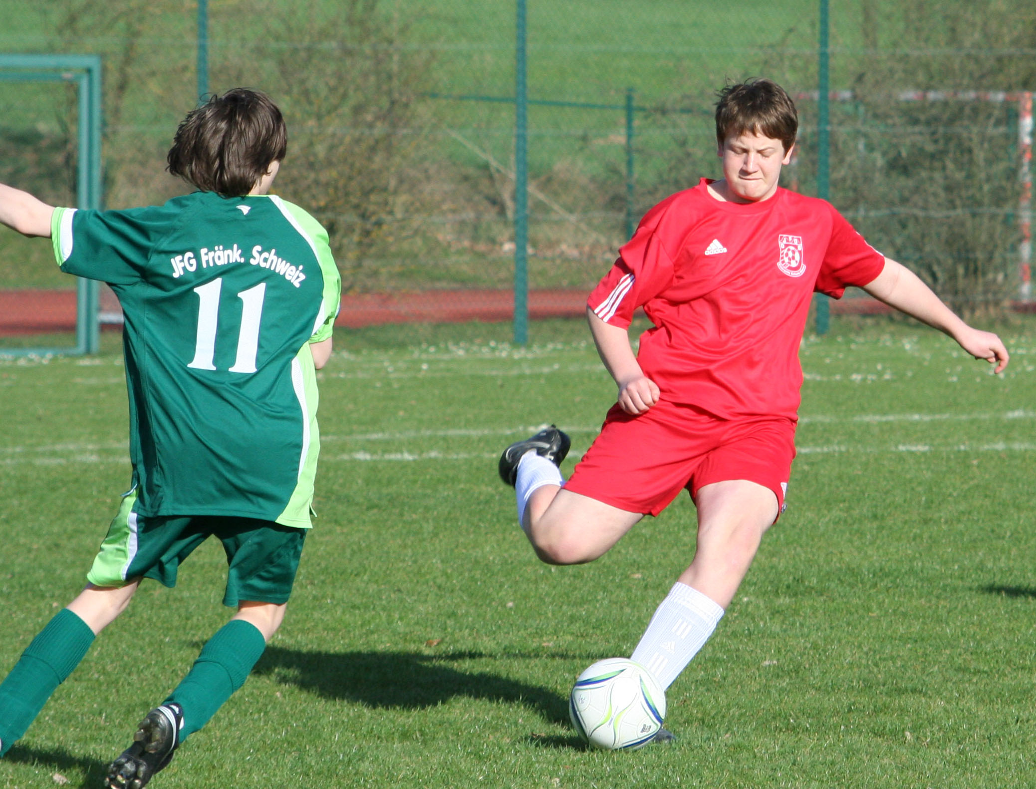 Ein interessantes und hochklassiges C-Jugendspiel sahen die Zuschauer am Freitagabend in Ludwigschorgast. Unsere JFG und die Saas Bayreuth lieferten sich ein Spiel auf gutem Niveau mit vielen Torchancen auf beiden Seiten. Nach einer kurzen Abtastphase übernahmen die Einheimischen das Kommando. Gestützt auf eine sichere Abwehr und ein lauffreudiges Mittelfeld konnten die Jungs ein ums andere Mal gefährlich vor dem Tor der Gäste auftauchen. Besonders die rechte Seite mit Felix Hollweg, Andreas Fischer und Christoph Hohner wusste hier besonders zu gefallen. Das 1:0 für die Einheimische wurde auch über Rechts eingeleitet. Nach einer schönen Kombination, schickte Andreas Fischer Christoph Hohner mit einem langen Pass auf die Reise, dieser flankte scharf und flach nach innen, nachdem er sich den Ball vom Gegner zurückerkämpft hatte, und Marcel Reißaus vollendete unhaltbar für den Gästetorwart. Dieser Treffer schockte die Gäste aus Bayreuth etwas in ihrem Spielfluss und ermöglichte den Einheimischen weitere Chance, die leider nicht genutzt werden konnten. Mit 1: 0 ging man in die Pause. Nach der Halbzeit zeigten die Gäste ihr wahres Leistungsniveau. Die Aktionen wurden schneller, das Spiel noch flotter und die technischen Vorteile der Gäste zeigten ihre Wirkung. Daniel Hacker wurde zum Dreh- und Angelpunkt der Angriffsaktionen der Saaser. In der 40. Minute war es dann so weit. Am 16-Meter Raum wurde nicht konsequent nachgesetzt und die Gäste schlossen einen Angriff mit einem fulminanten Schuss aus 11 Metern von halblinks ins lange Eck, unhaltbar für Torwart Jens Schmeißner, ab. Ein Minute später hätten die Gäste sogar in Führung gehen können, doch wurde ein zu Recht gegebener Foulelfmeter verschossen. Die JFG versuchte nun durch Konter zum Erfolg zu kommen, da die Gäste mehr und mehr überlegen waren. Das 1:2 und 1:3 für die Saas durch einen Doppelschlag in der 61. und 66. Minute, begünstigt durch individuelle Abwehrfehler, besiegelten die Niederlage der Einheimischen. Zeigt unsere Mannschaft in den nächsten Spielen gegen Mitkonkurrenten um den Klassenerhalt ähnliche Leistungen, so dürfte für uns das Thema Abstieg ad Acta zu legen sein. An dieser Stelle nochmals ein Lob an alle eingesetzten Aktiven für den gezeigten Einsatz, Kampfgeist und Willen. Zwar verloren, aber dennoch - tolle Leistung Jungs!!!!!!!!!