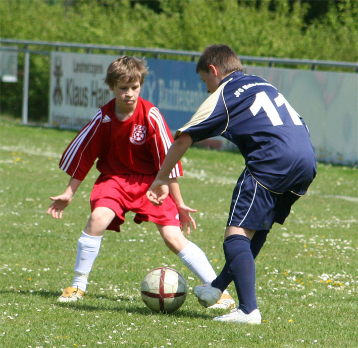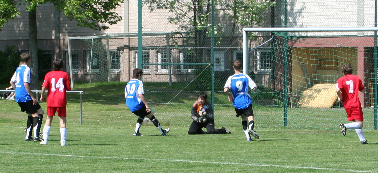 Am Samstag wollte die JFG mit einem Sieg im Heimspiel gegen die JFG Hummelgau den Klassenerhalt so gut wie unter Dach und Fach bringen. Gegen die Gäste stand ja auch noch aus dem Hinspiel eine Rechnung offen, als man nach einem „Scheibenschiessen“, recht unglücklich mit 3:2 den Kürzeren zog. Mit Einsatz, Kampfkraft und Engagement sollte diese nun im Rückspiel in Neuenmarkt umgesetzt werden. Doch Erstens kommt es anders als man Zweitens denkt. Hummelgau begann druckvoll und unsere Jungs schienen gedanklich in den ersten Minuten noch in der Kabine zu sein. Die Gäste störten beherzt im Mittelfeld und hatten über ihre rechte Seite mehrere Möglichkeiten mit 1:0 in Führung zu gehen. Etwas überraschend fiel dann in der 10. Minute die Führung für die JFG Schiefe Ebene. Marcel Reißaus, der eine glänzende Leistung bot, setzte nach einem abgeschlossenen Angriff nach, erkämpfte sich den Ball zurück, spielte einen klugen Pass nach rechts auf Jonas Hoffmann, und dieser überraschte die gesamte Abwehr der Gäste mit einer langen Flanke in den Strafraum, in dem Leo Henke goldrichtig stand und aus 5 Metern zur 1:0 Führung für uns vollendete. Von da an liefe unser Spiel und unsere Jungs bekamen den Gegner immer besser in den Griff. Die Abwehr stand sicherer, das Mittelfeld setzte den Sturm mit schnellen Pässen besser in Szene und der Angriff erarbeitete sich eine Chance nach der anderen, wobei die Ausbeute zu wünschen übrig lies. So stand es zur Halbzeit 1:0, obwohl es leicht 3:0 hätte stehen können. Nach der Halbzeit das gleich Bild. Hummelgau war zu passiv, lief nur nebenher und Schiefe Ebene gestaltete das Spiel jedoch ohne zählbares erzielen zu können. Das Endergebnis erzielte dann Marcel Reißaus bereits in der 42. Minute, als er einen langen Pass von Alexander Wesner an der Mittellinie aufnahm, die gesamte Abwehr der Gäste, einschließlich deren Torwart düpierte und das 2:0 erzielte. Eng hätte es nochmals werden können, als Mitte der zweiten Halbzeit den Gästen ein klarer Foulelfmeter durch die sonst hervorragend leitende Schiedsrichterfrau Zimmermann verwehrt wurde. Gegen Ende des Spiels und im Gefühl des sicheren Sieges schaltete die JFG einen Gang herunter und Hummelgau erspielte sich Möglichkeiten, die jedoch durch Torwart Jens Schmeißner mit tollen Reflexen zunichte gemacht wurden. Der Sieg der Einheimischen ging voll in Ordnung und hätte bei konsequenter Chancenauswertung durchaus noch um drei bis vier Tore höher ausfallen können. Aber egal – wichtig waren die drei Punkte, die wir nun mit einem Auswärtssieg nächste Woche in Speichersdorf „vergolden“ müssen. Letztendlich nochmals ein Lob an die komplette Mannschaft für die disziplinierte und tolle Leistung – außer in den ersten 10 Minuten.