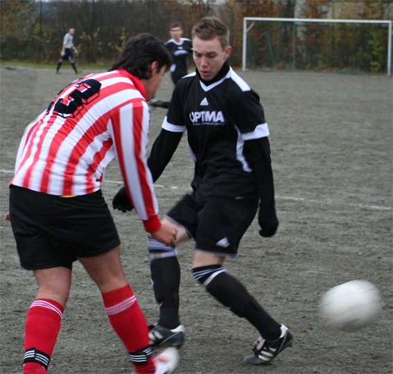 Andrè Warzecha und Dominik Paul sehen in aller Ruhe zu wie der Hirschiader den Ball in unserem Strafraum annehmen kann - mit diesem Defensivverhalten verhindern wir keine Tore