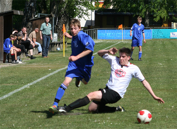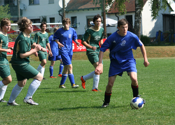 Am Sonntag zeigte unsere B-Jugend endlich wieder einmal was sie zu leisten fähig ist. Mit einer überzeugenden, engagierten und spielerischen Glanzleistung wurde der Tabellendritte, SV Motschenbach, völlig verdient mit 8:1 nach Hause geschickt. Wir nutzten unsere Chancen rigoros aus und führten bis zur 22. Minute bereits mit 4:0 durch Treffer von Domenik Hollweg und Florian Korn. Das Spiel war hier bereits entschieden und jeder dachte es würde wieder so verwaltet werden wie gegen Trebgast. Doch im Gegenteil, die Mannschaft erinnerte sich an das Vorrundenspiel in Motschenbach, an die dortigen Vorfälle und an das blamable Abschneiden unserseits. Angetrieben von dem abermals vor Spielfreude sprühenden Alexander Wesner, kamen die Offensivkräfte Marcel Reißaus, Jonas Hofmann und Hermann Hartman zu weiteren Chancen, die auch entsprechend verwertet wurden. Das Mittelfeld mit Marc Hentschel, Andreas Fischer und Offensivverteidiger Felix Hollweg setzte die Gäste zusätzlich mit unter Druck, so das die Abwehrreihe mit Max Sünkel, Christoph Hohner, Manuel Mösch und Andre Warzecha einen relativ geruhsamen Sonntagvormittag verleben konnten. Einzig beim völlig unnötigen Ehrentreffer der Gäste ließ die Abwehr, Keeper Jens Schmeißner, der sich in zwei Situationen besonders auszeichnen konnte, alleine. Die weiteren Treffer zum 8:1 Entstand erzielten noch Florian Korn, Hermann Hartmann und Alexander Wesner. Von dieser Stelle aus nochmals ein Lob an alle eingesetzten Spieler – TOLLE LEISTUNG JUNGS. Schiedsrichter Matthias Than hatte mit der Partie keinerlei Schwierigkeiten und zeigte ebenfalls eine glänzende Leistung. Am Ende noch herzlichen Glückwunsch von der B-Jugend an die A-Jugend zur vorzeitigen Meisterschaft in der U19-Gruppe3 Bayreuth/Kulmbach.