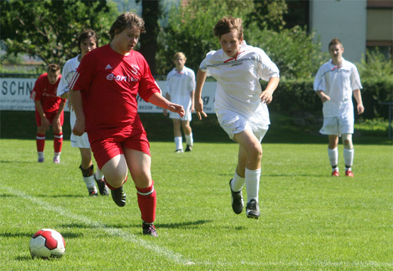 Im vorletzten Vorbereitungsspiel gegen die neugegründete JFG Thurnauer Land zeigten unsere Jungs eine anspruchsvolle Leistung. Gleich zu Beginn übernahm die Mannschaft das Kommando und hatte zwei gute Möglichkeiten um in Führung zu gehen. Das 1:0 für unsere Mannschaft fiel dennoch sehr glücklich, als nach einem Eckball ein Gästespieler versehentlich ins eigene Tor verlängerte. Seine Goalgetterqualität stellt Marcel Reißaus beim 2:0 für unsere Farben unter Beweis. Ein langer Pass aus dem Mittelfeld, den Ball kurz angenommen, sich orientiert und ohne lange zu Fackel das 2:0 erzielt – g… Tor - so muss ein Sturmführer tätig sein. Mit der Führung im Rücken ließen es unsere Jungs nun etwas ruhiger angehen und Thurnau konnte dies nutzen. Torwart Jens Schmeißner verhinderte mit Glanzparaden mehrere 100%ig Chancen der Gäste, war jedoch am Anschlusstreffer der Gäste vor der Halbzeit machtlos. Nach der Pause und diversen Umstellungen in der Mannschaft zeigten beide Teams weiterhin attraktiven Jugendfußball. Das 3:1 erzielte abermals Marcel Reißaus nach einer starken Einzelleistung. Danach setzte Thurnau nun alles auf eine Karte und drängte noch stärker. Zwei individuelle Fehler in der Abwehr ermöglichten den Gästen den verdienten Ausgleich in der insgesamt interessanten Partie. Bei der JFG konnten besonders der zweifache Torschütze Marcel Reißaus, der erstmals als Abwehrchef eingesetzte Christoph Hohner und Florian „Schweinsteiger“ Korn, der sich mehr und mehr zur zentralen Figur des Spiels entwickelt, besonders gefallen. Auch alle anderen eingesetzten Spieler zeigten eine sehr gute Leistung und sollen hier nochmals gelobt werde. Schiedsrichter Patrick Hoffmann leitete die faire Partie gewohnt souverän und sicher.