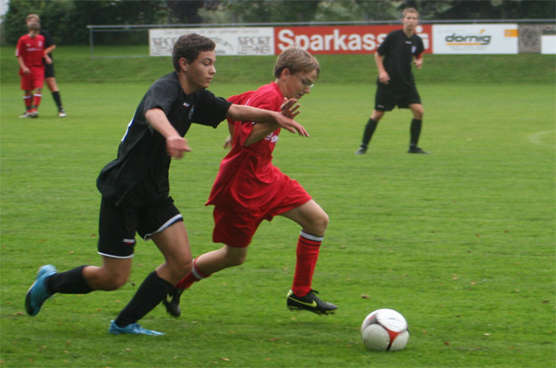 Eine starke Leistung zeigte Thomas Susdorf (rotes Trikot), der als C-Jugendlicher bereits jetzt fest in der B-Jugend spielt, im Freundschaftsspiel gegen die JFG Thurnauer Land.
