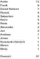 1:0 30.Min. (Jan) 2:0 36.Min (Andre) 3:0 58.Min (Daniel) 4:0 69.Min (Rene) 5:0 81.Min (Daniel) 6:0 86.Min (Frank)