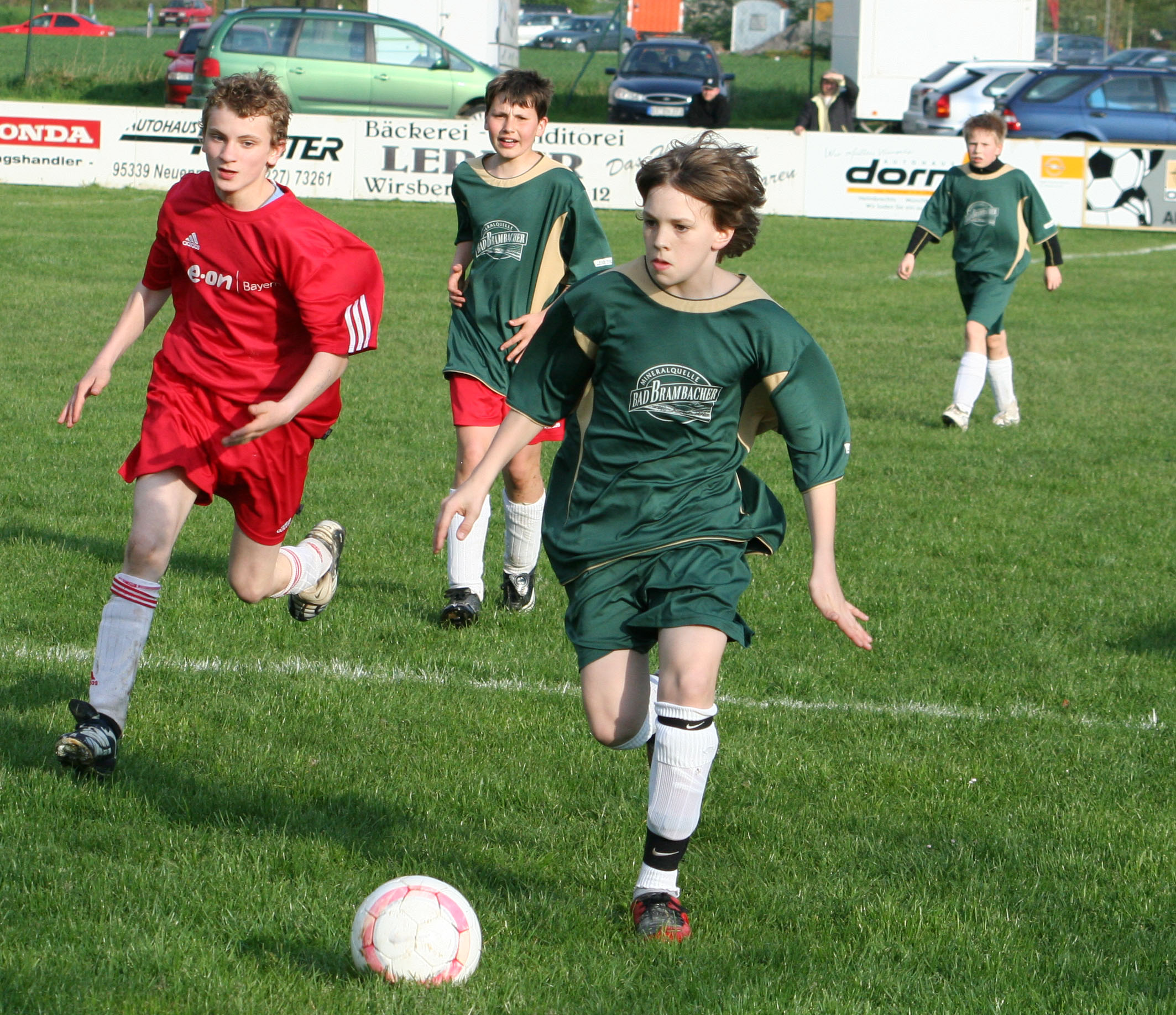 Am Samstag spielte unsere C-Jugend gegen die JFG Steinachtal. Wegen der vorausgegangenen heftigen Niederschläge wurde das Spiel kurzfristig von Ludwigschorgast auf den Hartplatz nach Neuenmarkt verlegt, der einwandfrei bespielbar war. Beide Mannschaften zeigten in der ersten Hälfte ein offenes und interessantes Spiel, in der die JFG Eintracht Schiefe Ebene nicht unverdient aber dennoch etwas glücklich mit 2:0 führte. Das 1:0 in der 13.Minute erzielte Marc Hentschel mit einer Bogenlampe aus 18 Metern, bei der der Torwart der Gäste sehr schlecht aussah. Das 2:0 in der 33. Minute durch Dominik Müller resultierte aus einem tollen Doppelpaßspiel mit Marcel Reißaus an der 16 Meter Linie. Nach der Halbzeit spielten die Jungs der Eintracht ihre konditionellen Vorteile aus und ließen die Gäste nicht mehr zur Entfaltung kommen. Das 3:1, wiederum durch Dominik Müller, durch einen strammen Schuss von der Strafraumgrenze und das 4:1 durch Alesandro Bochtis, der überlegt aus 11 Metern nach einer feinen Einzelleistung einschob, waren die logische Folge. Zwischenzeitlich kamen die Gäste auf 2:1 heran, als Torwart Jens Schmeißner Libero Alexander Wesner unglücklich im eigenen 5-Meter Raum anschoss und der Ball ins Tor kullerte. Ein Lob der gesamten Mannschaft für ihren Einsatz und ihrer Spielfreude, besonders der Defensive, die sicher stand und den Stürmern der Gäste nur wenig Entfaltungsmöglichkeit ließ. Steinachtal zeigte eine Leistung, die dem momentanen Tabellenplatz keineswegs entspricht und war ein Gegner der einen positiven Eindruck hinterließ.