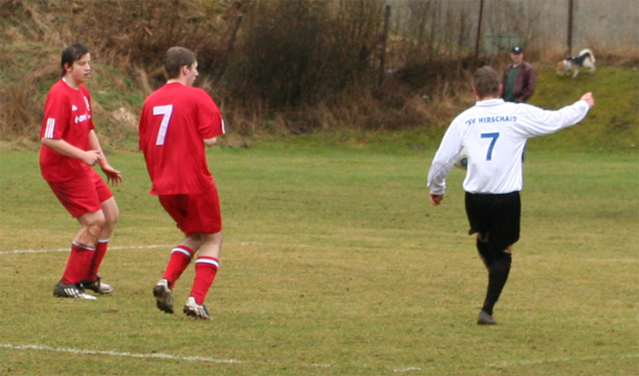 Andrè Warzecha und Dominik Paul sehen in aller Ruhe zu wie der Hirschiader den Ball in unserem Strafraum annehmen kann - mit diesem Defensivverhalten verhindern wir keine Tore