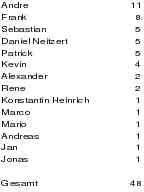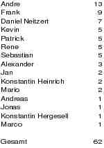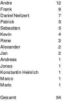 1:0 30.Min. (Jan) 2:0 36.Min (Andre) 3:0 58.Min (Daniel) 4:0 69.Min (Rene) 5:0 81.Min (Daniel) 6:0 86.Min (Frank)